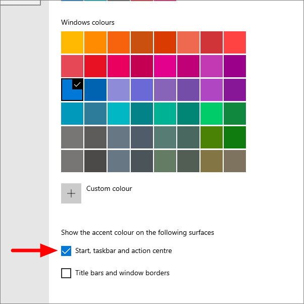 Select a color of your choice under ‘Choose your accent colour’ and then tick the checkbox ‘Start, taskbar and action centre’.