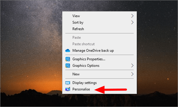 To change the Taskbar color, right-click on the desktop and select ‘Personalise’.