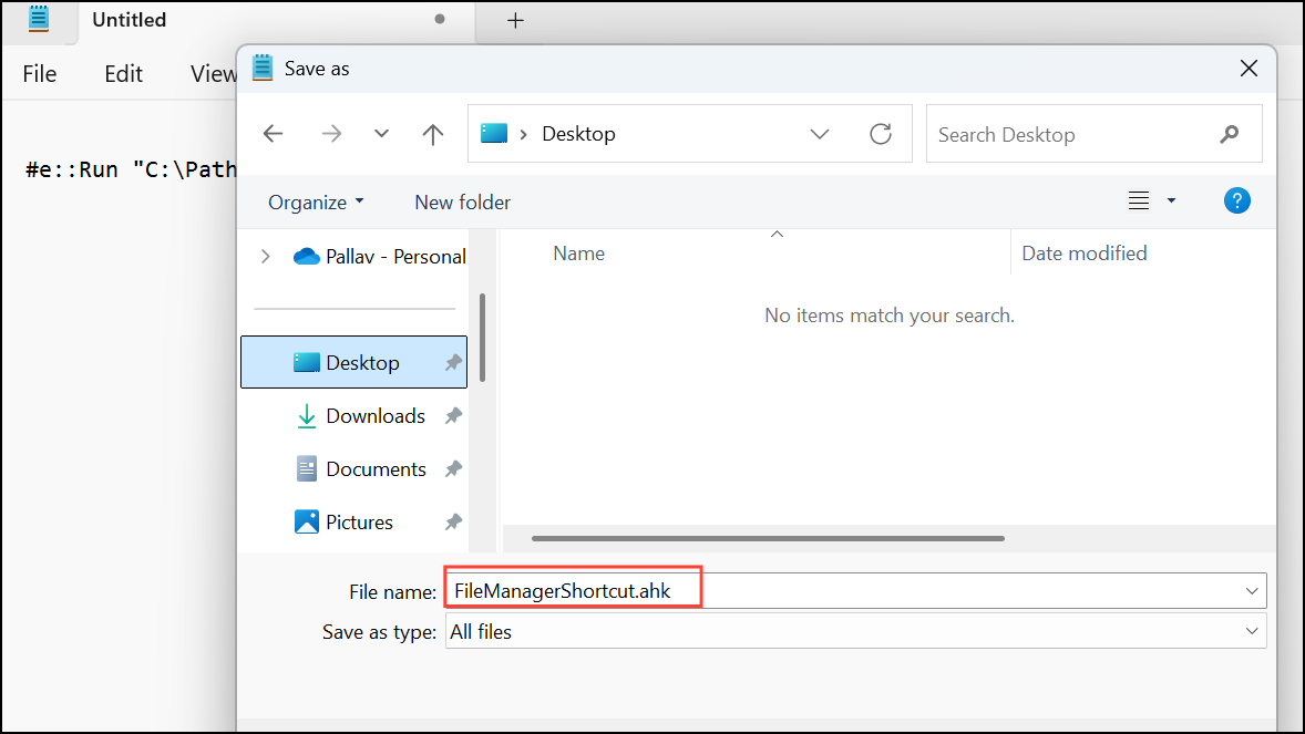 Step 3: Save the file with an .ahk extension (e.g., FileManagerShortcut.ahk).