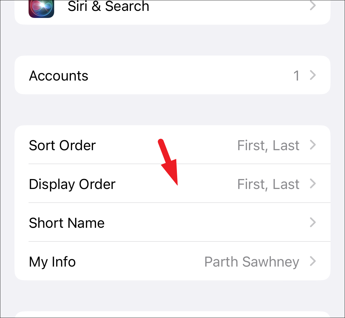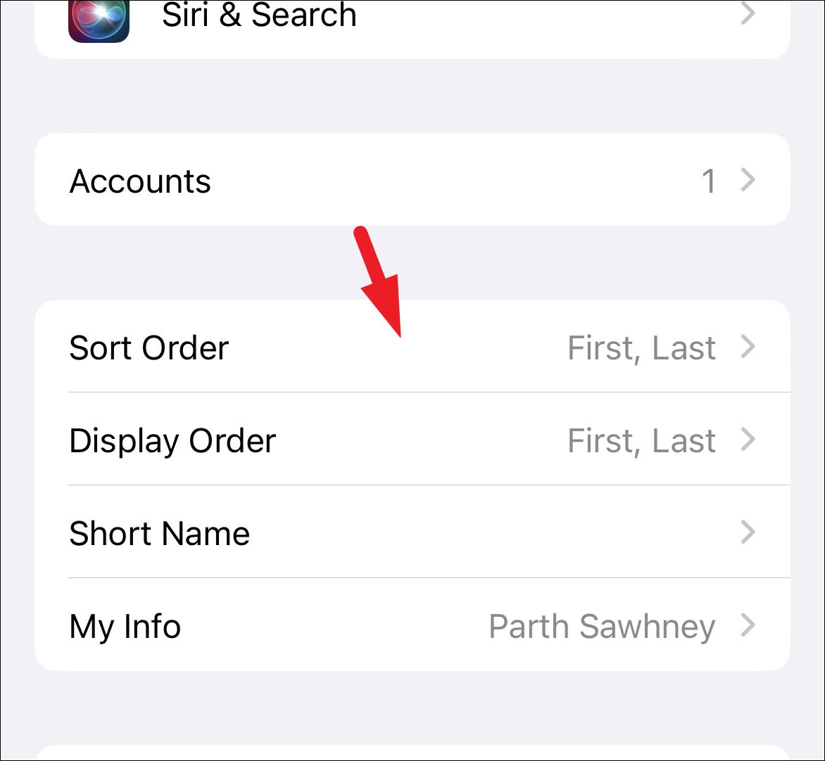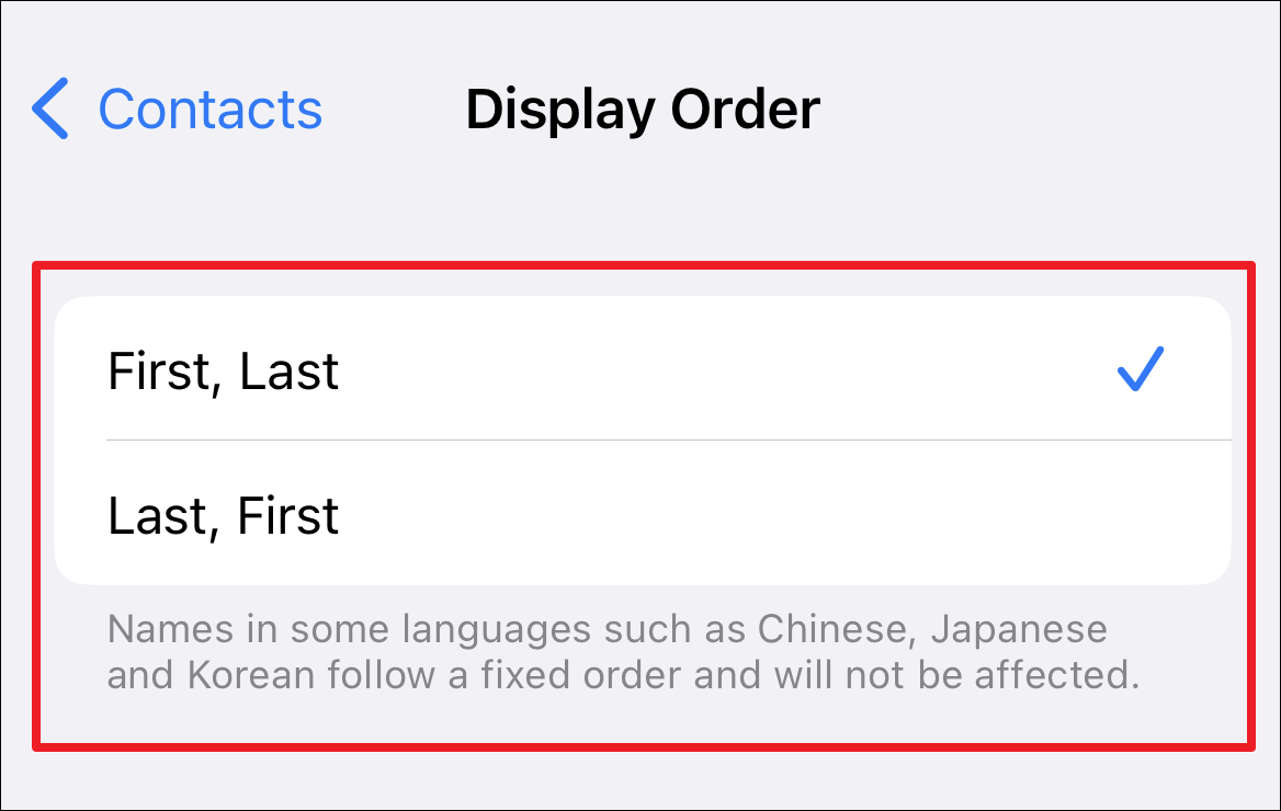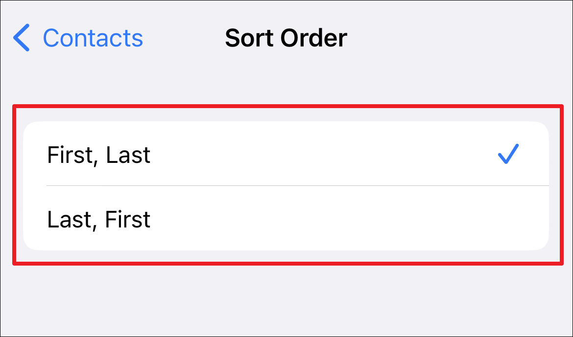 After that, tap on the order by which you’d prefer to have your contacts sorted. First, Last would do exactly the opposite of Last, First sorting that we explained above. With this sorting, contacts would be sorted with the first alphabet of the First name, and then it would consider the first alphabet of the last name.