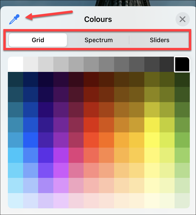 A pane for selecting colors will open. You can select a color from the grid, spectrum, or sliders. You can even use the color picker to pick a color from the wallpaper. Tap ‘x’ to close the colors pane.