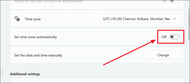 On the ‘Date & Time’ settings screen, scroll down a bit and you’ll see the ‘Set time zone automatically’ option. Click on the toggle switch next to it to turn it OFF.