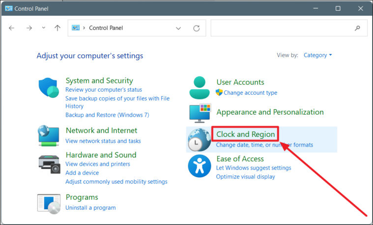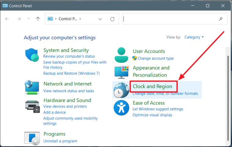 On the Control Panel window, select ‘Clock and Region’.