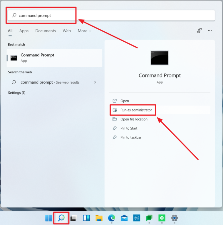 Click the ‘Search’ button in the taskbar and enter ‘Command Prompt’ in the search bar. Next, click the ‘Run as administrator’ option below the app name and icon on the right side of the search results.