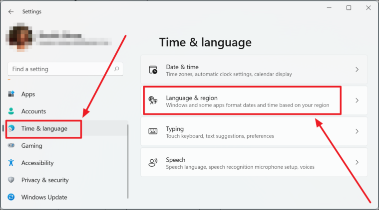Select the ‘Time & language’ option from the left side of options on the Settings window. Next, click the ‘Language & region’ option on the ‘Time & language’ screen on the right.