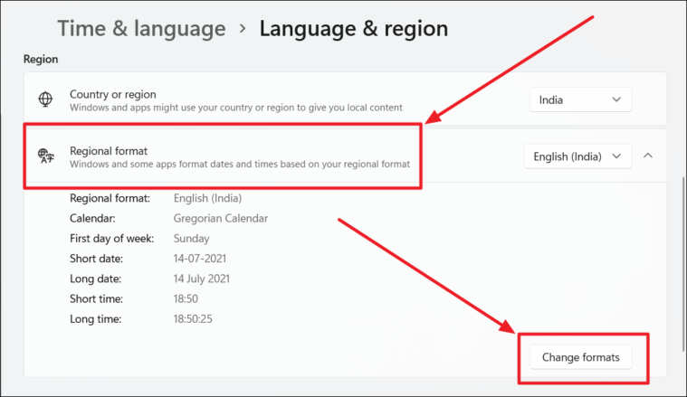 Click the ‘Regional format’ option on the ‘Language & region’ page and then click the ‘Change formats’ button at the bottom right corner of the drop-down.