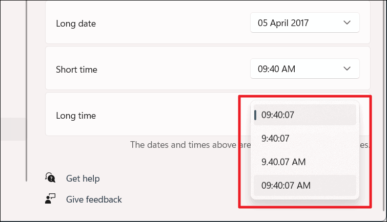 To change the ‘Long time’ format, click the drop-down on the ‘Long time’ option and select the format.