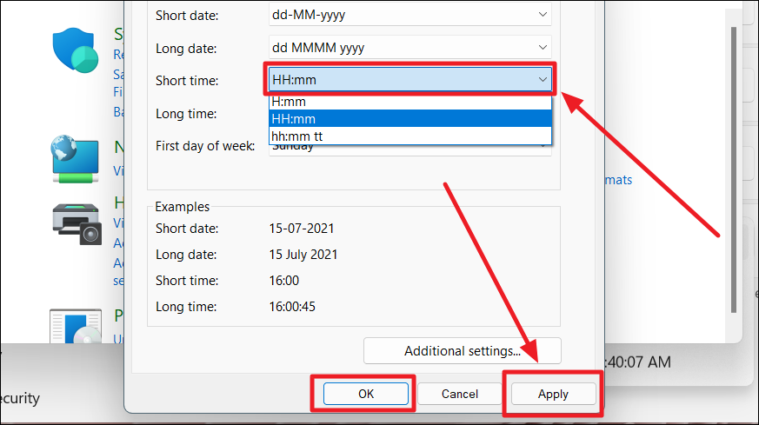 Click the drop-down box next to the time you wish to change and choose the format from the drop-down menu. Click ‘Apply’ once you’re done and then, hit ‘OK’.