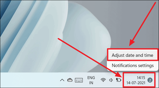 Right-click the date, time, and notifications box on the rightmost corner of the taskbar. Then, select ‘Adjust date and time’ from the menu options.