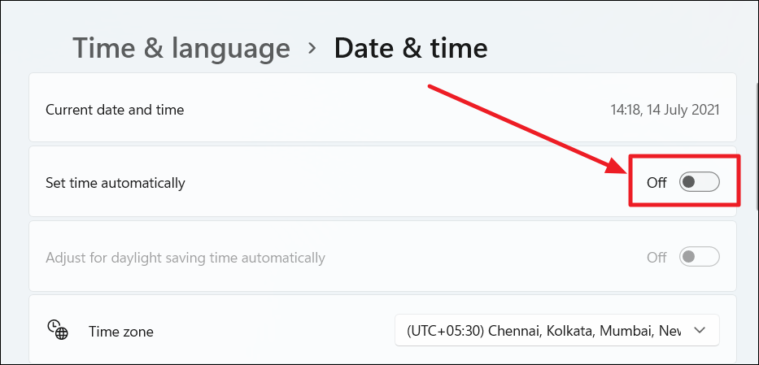 The ‘Date & time’ settings page will open. Click the toggle bar adjacent to the ‘Set time automatically’ option to turn it OFF.