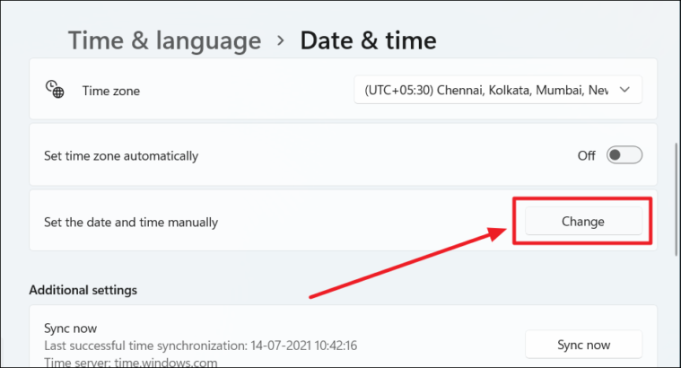 Then scroll down a bit and you’ll see the ‘Set date and time manually’ option. Click the ‘Change’ button next to it.