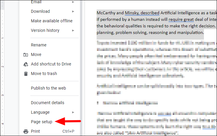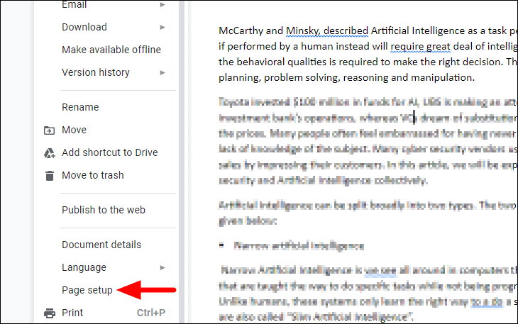 Step 2: From the drop-down menu, select Page setup.