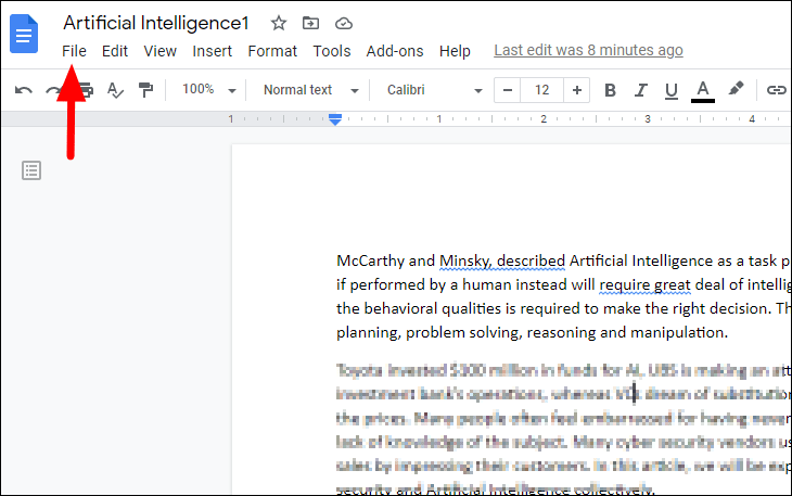 Step 1: To change the orientation of the whole document, make sure no text is selected. Click on the File menu at the top-left corner of the screen.