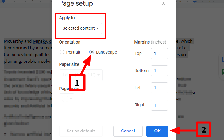 Step 3: In the Page setup dialog box, ensure that the Apply to drop-down menu is set to Selected content. Under the Orientation section, select the Landscape option. Click OK to apply the changes to the selected content.