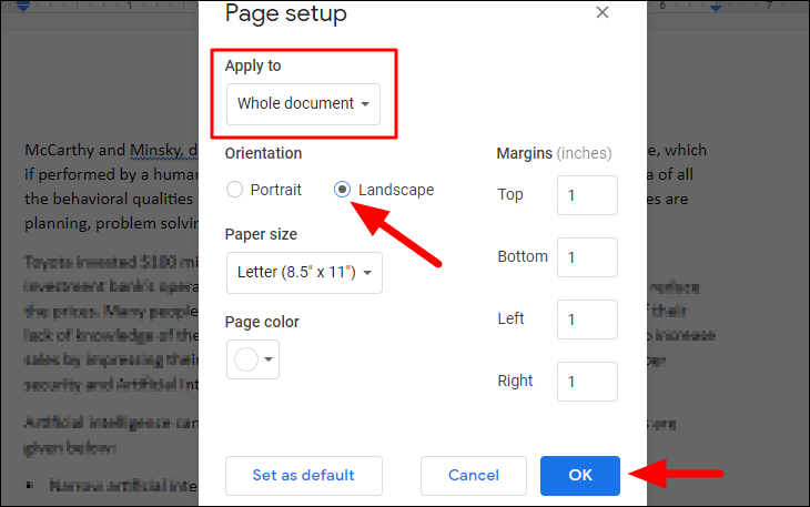 Step 3: In the Page setup window, ensure that the Apply to option is set to Whole document. Under the Orientation section, select Landscape. Click OK to apply the change to the entire document.