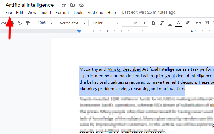 Step 1: Highlight the section of your document that you want to display in landscape orientation. Once selected, click on the File menu located at the top-left corner of the Google Docs window.