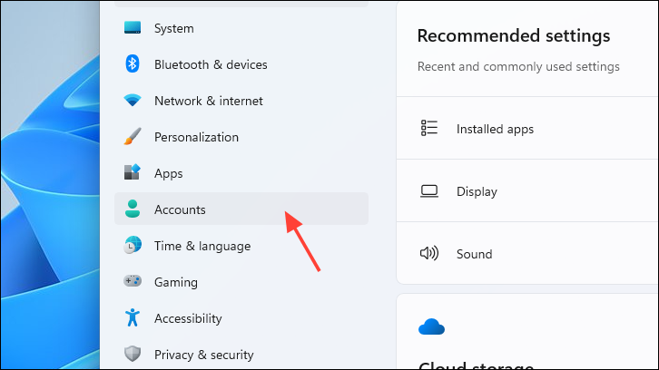 Step 1: If you don't have another administrator account, you need to create one. Press Windows+I to open the Settings app. From the left sidebar, select 'Accounts'.