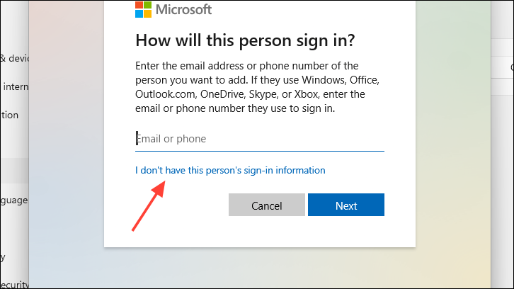 Step 4: In the Microsoft account window, select 'I don't have this person's sign-in information'.