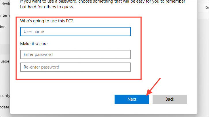 Step 6: Enter a username and password for the new account. Click 'Next' to create the account.