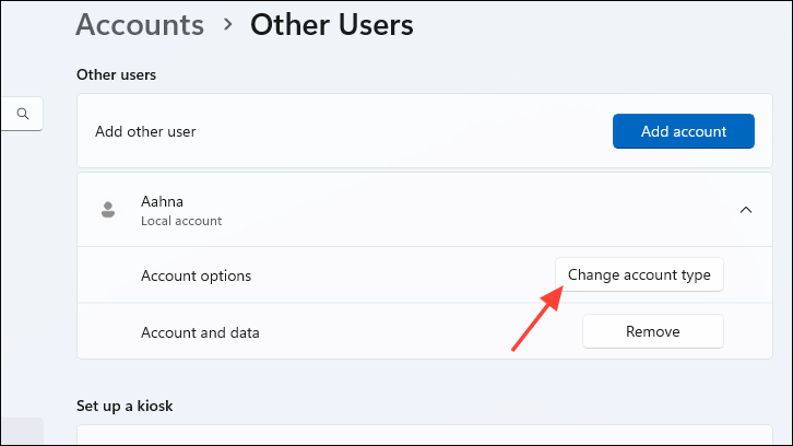 Step 7: After creating the account, grant it administrator privileges. Click on the newly created account and select 'Change account type'.
