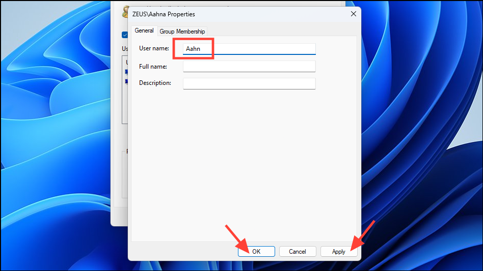 Step 13: In the 'User name' field, enter the new name you want for the user folder. If desired, fill in the 'Full Name' field with how you want your name displayed at login. Click 'Apply' and then 'OK' to save the changes.