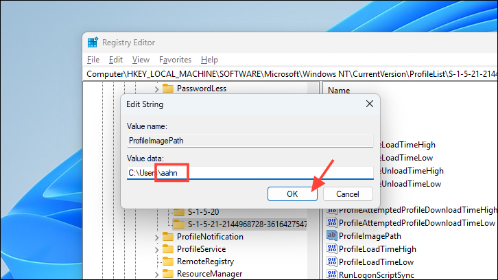 Step 22: Modify the path in the 'Value data' field to reflect the new user folder name after C:\Users\. Be careful not to change any other part of the path. Click 'OK' to save the changes and close the Registry Editor.
