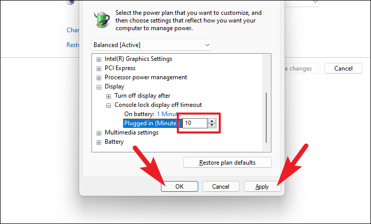 Step 9: Set your preferred time (in minutes) for both On battery and Plugged in options, then click Apply and OK to save the changes.
