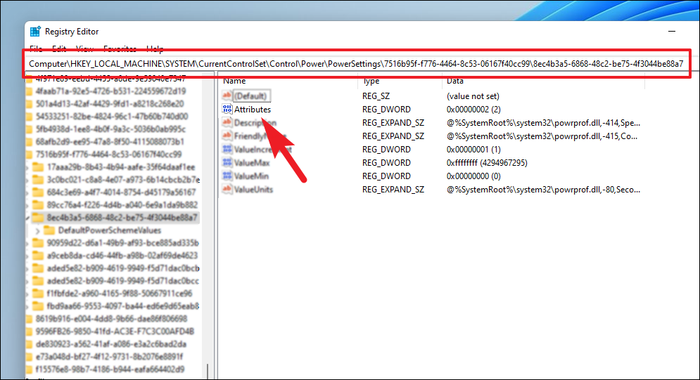 Step 2: In the Registry Editor, navigate to the following path: Computer\HKEY_LOCAL_MACHINE\SYSTEM\CurrentControlSet\Control\Power\PowerSettings\7516b95f-f776-4464-8c53-06167f40cc99\8ec4b3a5-6868-48c2-be75-4f3044be88a7.
