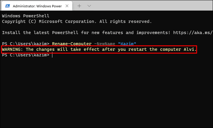 Switch to the PowerShell tab and enter this command, replacing "New Name" with your chosen name: