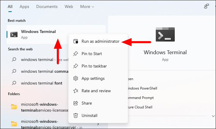 - Search for "Windows Terminal" in the Start menu, right-click it, and select "Run as administrator".