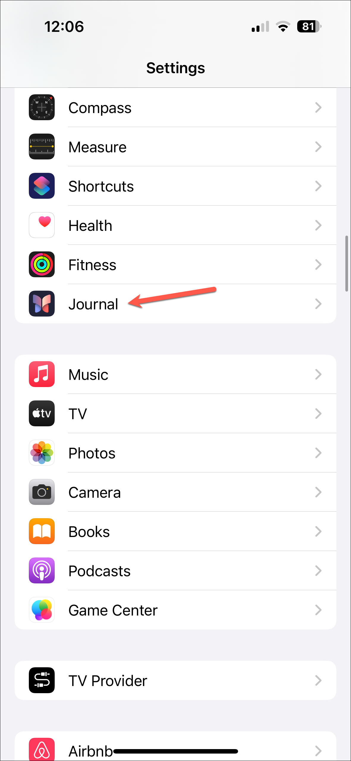 - Open the 'Settings' app on your iPhone, scroll down, and navigate to the 'Journal' option. It'll be in the section with the system apps.