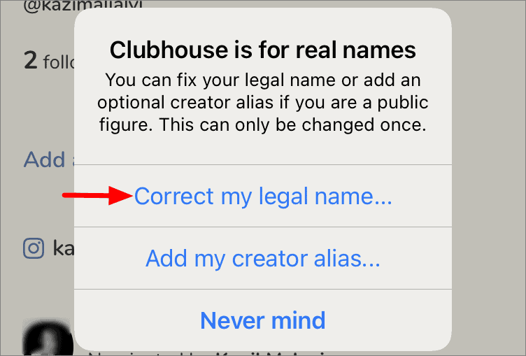 A permission box will pop up asking you to confirm the name change. You can change your name only once on Clubhouse, similar to the username. To proceed, tap on ‘Correct my legal name’, which is the first option.