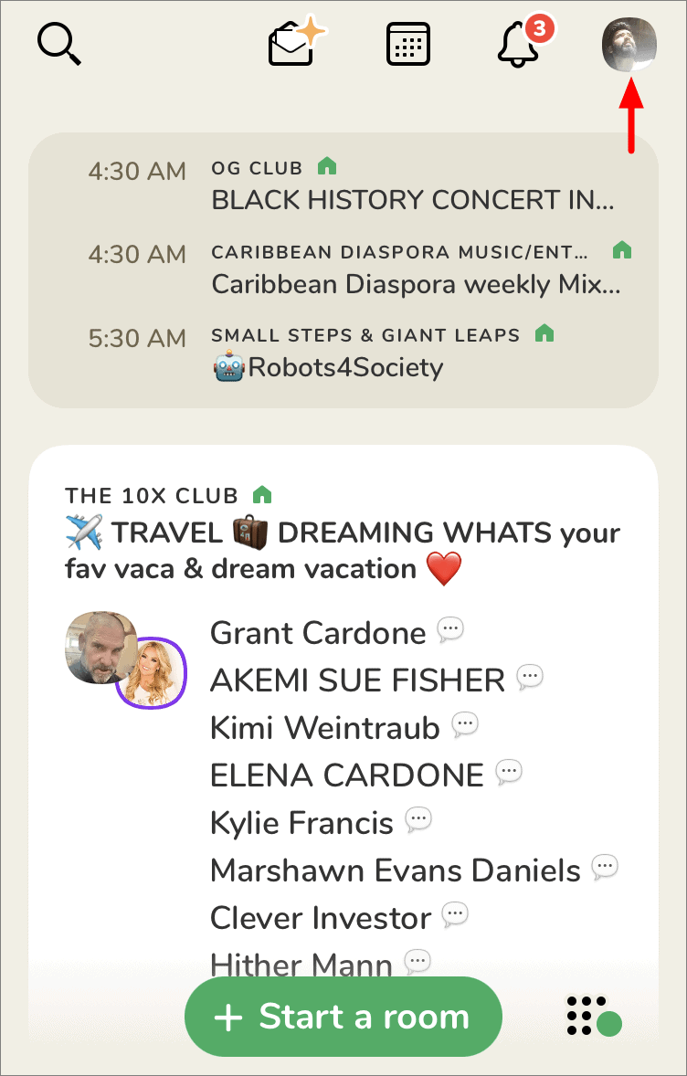When you launch the Clubhouse app, the first page is the Hallway, an app-specific term for the home screen. To change your name, tap on your photo, or the initials if you have not added a photo yet, at the top-right corner.