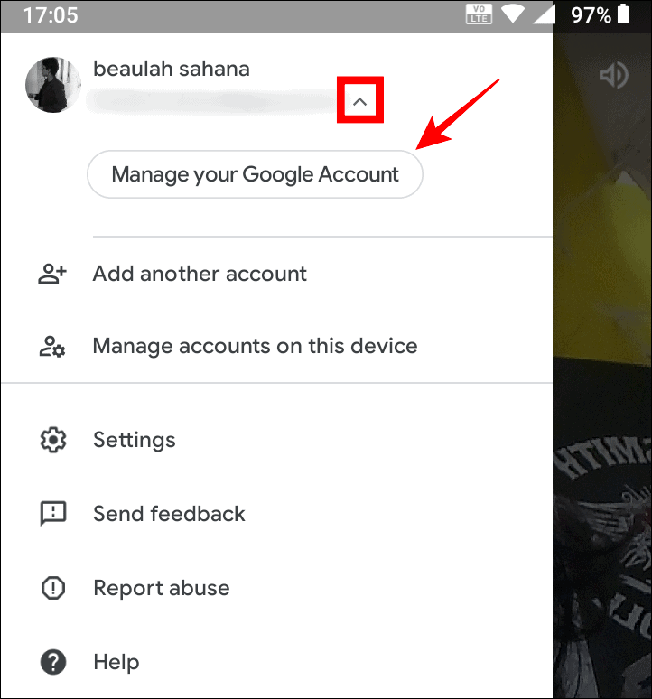 Tap on your name in the fly-in menu and then tap the ‘Manage your Google Account’ button from the expanded options.
