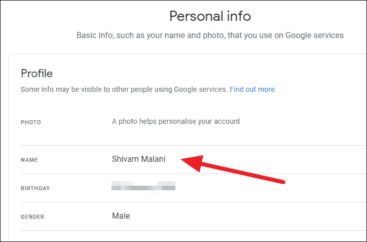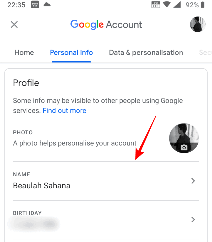 This will open your Google Account settings page, select the ‘Personal info’ tab and then tap on your ‘Name’ under the ‘Profile’ section on the screen.