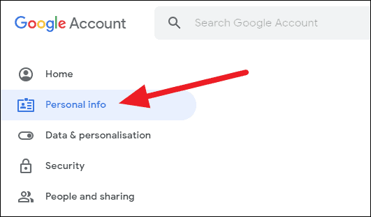 This will open your Google Account settings page in a separate tab in the browser. Click on the ‘Personal info’ option from the menu on the left.