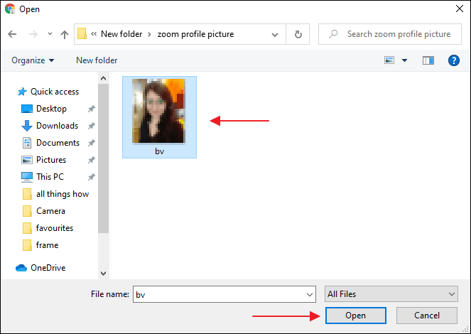 After selecting the image of your preference from your computer, click on the open button at the bottom. This would upload your image on zoom for cropping and saving.