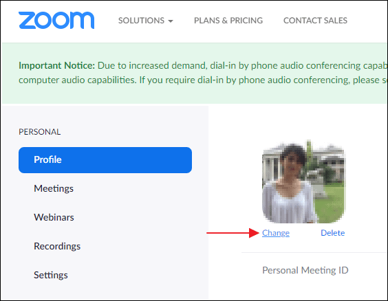 After signing in, your Profile settings page would automatically open. Your previous profile picture along with an option to ‘Change’ or ‘Delete’ will display in the Profile tab listed under Personal section. Choose the ‘Change’ option to move forward.
