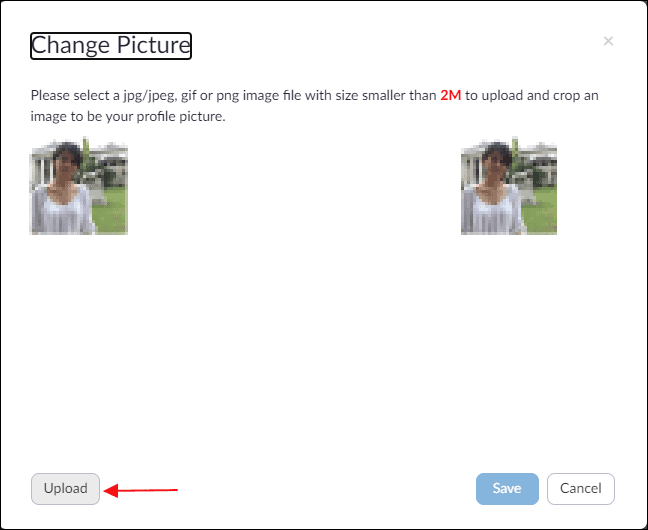 A ‘Change Picture’ screen will pop-up. You can upload a new profile picture from your device through this screen by clicking the ‘Upload’ button.