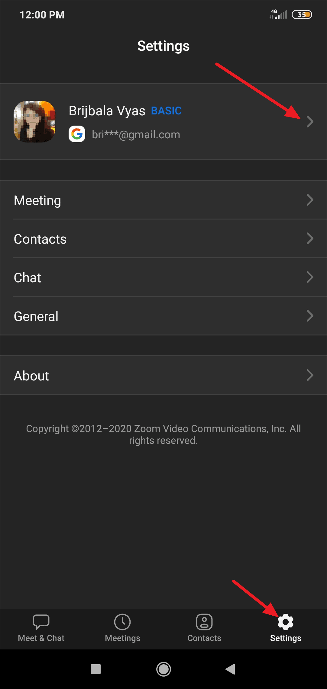 The process to change your profile picture on Zoom mobile app is not all that different. As a first step, you have to start with launching Zoom on your mobile device and at the bottom, click on ‘Settings’. After selecting settings, select the first tab with your basic profile information (with your name and email id on it).