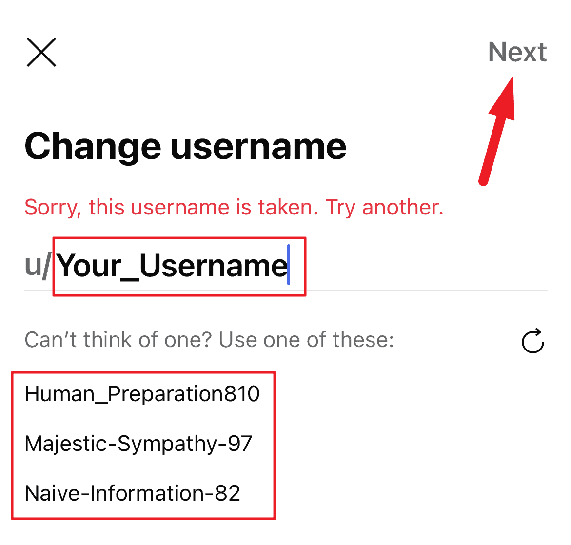 Now, either enter a username of your choice or select one from the suggestions. Then, tap on the ‘Next’ button to confirm and save the changes.
