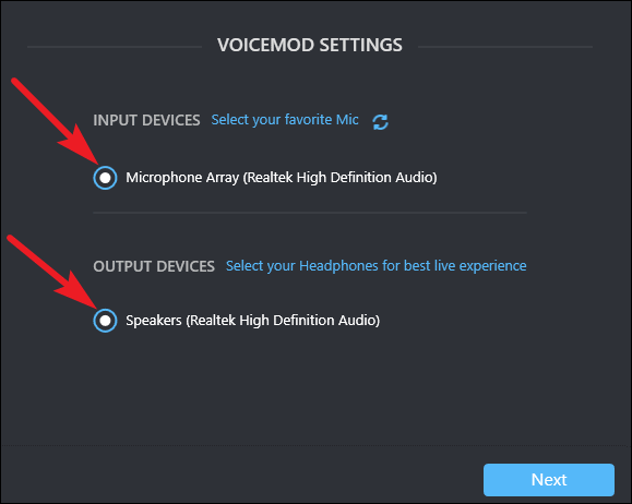 Step 1: Launch the Voicemod app after installation. You'll need to configure your audio devices for the app to work correctly. In Voicemod's settings, select your computer’s microphone as the input device and your speakers as the output device.