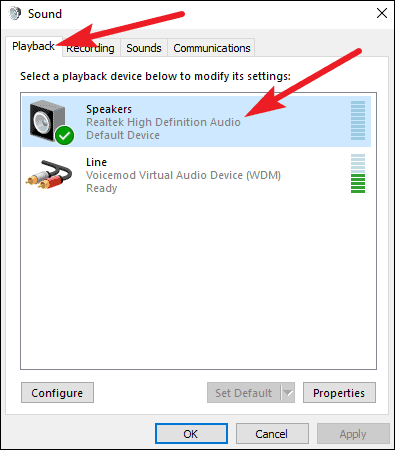 Step 3: In the Playback tab, ensure that your computer's speakers are set as the default device. If they aren't, select them and click Set Default.