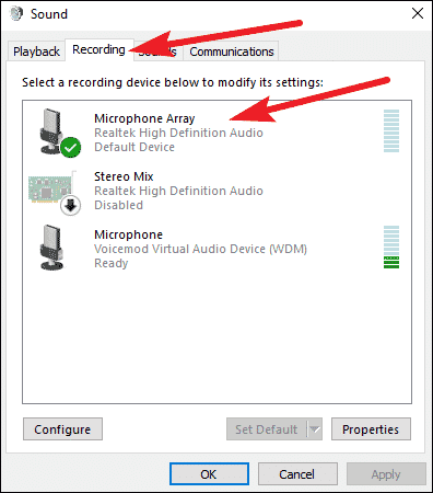 Step 4: Switch to the Recording tab. Here, make sure your computer's microphone is the default input device, not the Voicemod virtual microphone. Select it if necessary, click Set Default, and then click OK to apply the changes.