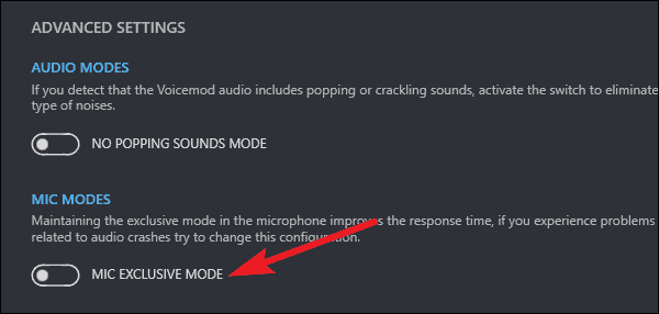 Scroll down to the Advanced Settings section and disable the Exclusive Mode toggle under Input Device. This should resolve any issues with hearing the voice effects.