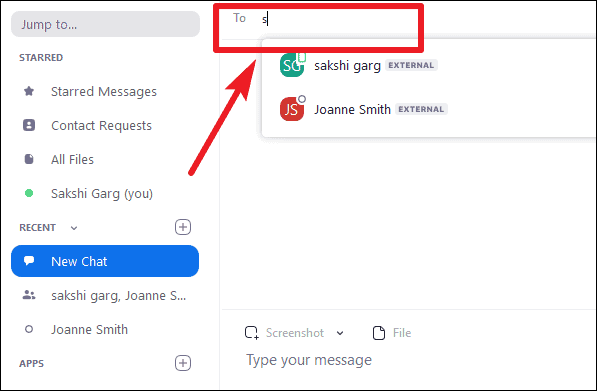The ‘New Chat’ screen will open. Type the contact name you want to start the chat with, or multiple names if you want to create a group in the ‘To’ section. Then proceed and type the message and send it. Zoom Chat also lets you send files or screenshots in a chat.