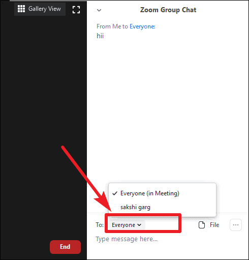The Chat screen will open on the right of your screen. By default, the recipient will be everyone in the meeting. To chat with a meeting participant privately, click on the drop-down menu next to the ‘To’ option and select the people you want to chat with. Private chats are not visible to the host.