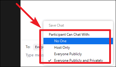 If you are the meeting host, you can also specify the chatting restrictions for the meeting. Click on the ‘More’ option (three dots) to view the context menu. The options will be under the ‘Participant Can Chat With’ section on the menu. Select ‘No One’ to disable the In-Meeting chat entirely. Or you can also put restrictions by selecting one of the options from ‘Host Only’, ‘Everyone Publicly’, or ‘Everyone Publicly and Privately’.