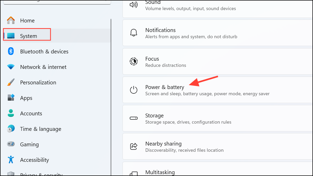 Step 2: In the Settings window, select System from the left-hand menu. From the list of options, click on Power & battery.