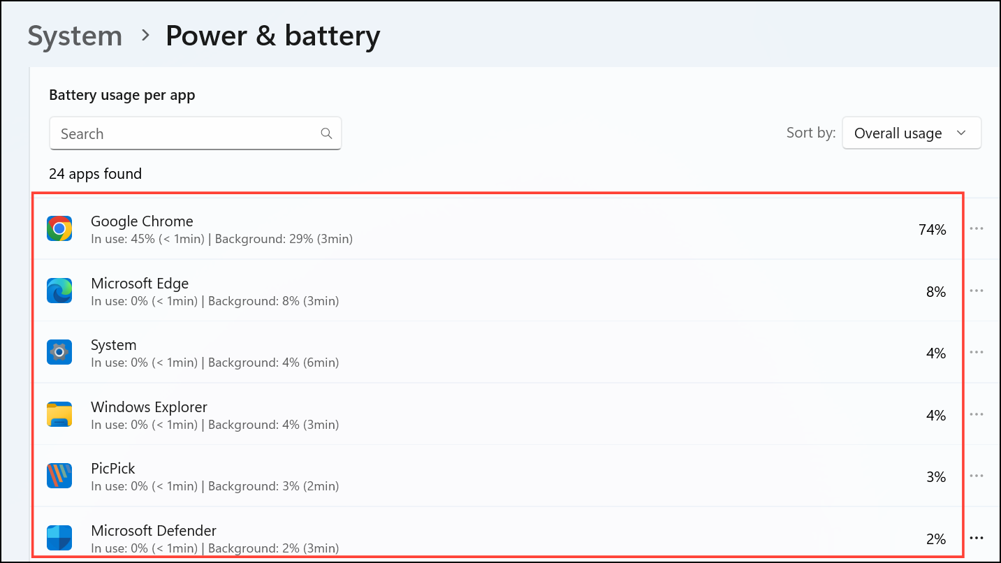 Step 4: In the Battery usage screen, you'll see a list of apps sorted by their battery consumption percentage. The apps at the top of this list are draining the most battery power. You can also select the timeframe (e.g., last 24 hours or last 7 days) from the dropdown menu to see historical battery usage data.
